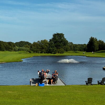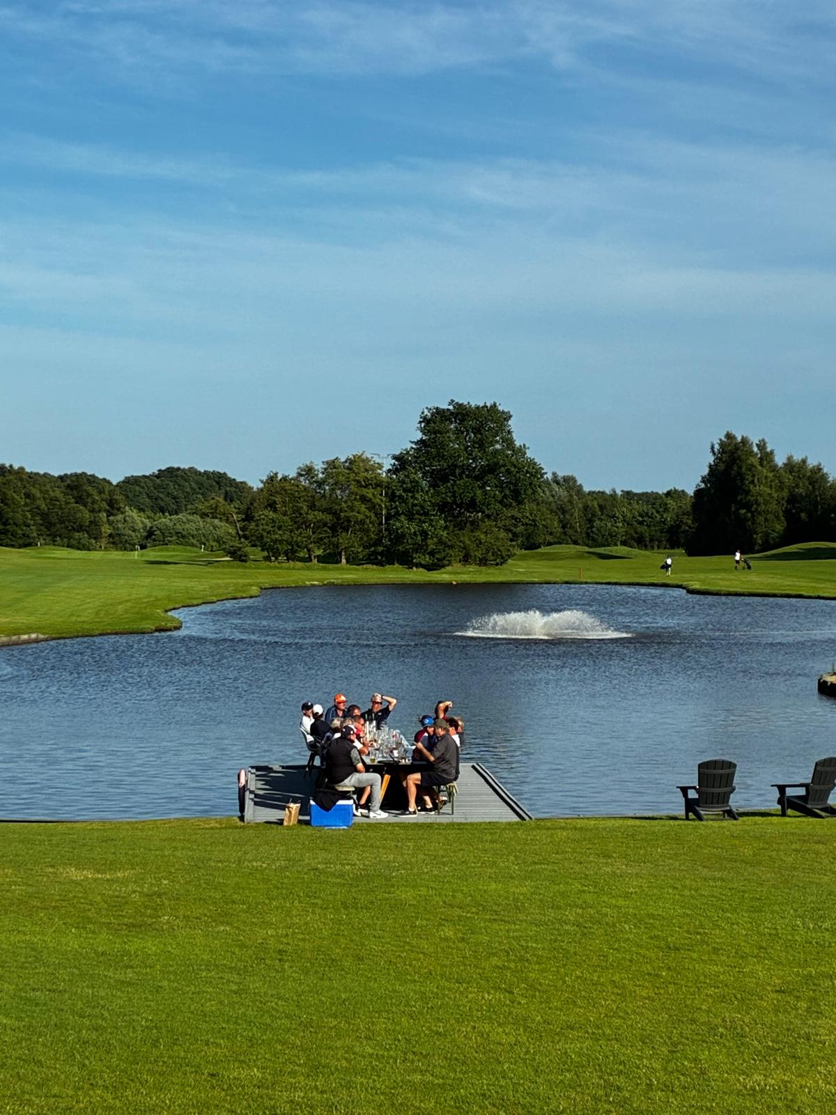 Nach der Runde trafen sich dann die ankommenden Flights auf dem herrlichen Steg neben dem Grün der 18. Bunkerschläge und gefallenen Putts wurden frenetisch gefeiert. Doch so schön es auch war, das Essen rief und so mussten wir den Steg schweren Herzens verlassen, um ums in der sehr gemütlichen Gastro weiter verwöhnen zu lassen. Neben den üblichen Preisen gab es noch eine sehr umfangreiche Tombola und Sonderpreise für diverse Platzierungen, u.a. einen liebevoll gestalteten Bierbeiner für den Nettoletzten.
